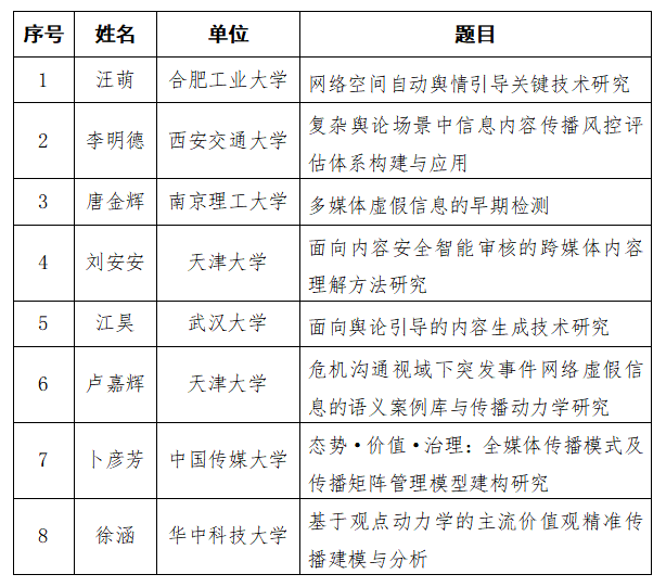 2020年10月,傳播內(nèi)容認知國家重點實驗室啟動了2020年度開放課題的申報工作,發(fā)布了開放課題指南。根據(jù)《傳播內(nèi)容認知國家重點實驗室開放課題管理辦法》和《傳播內(nèi)容認知國家重點實驗室開放課題2020年度申請指南》的相關(guān)規(guī)定,實驗室對接收到的課題申請書進行了形式審查、專家評審,擬資助以下8項課題開展研究,現(xiàn)予以公示。